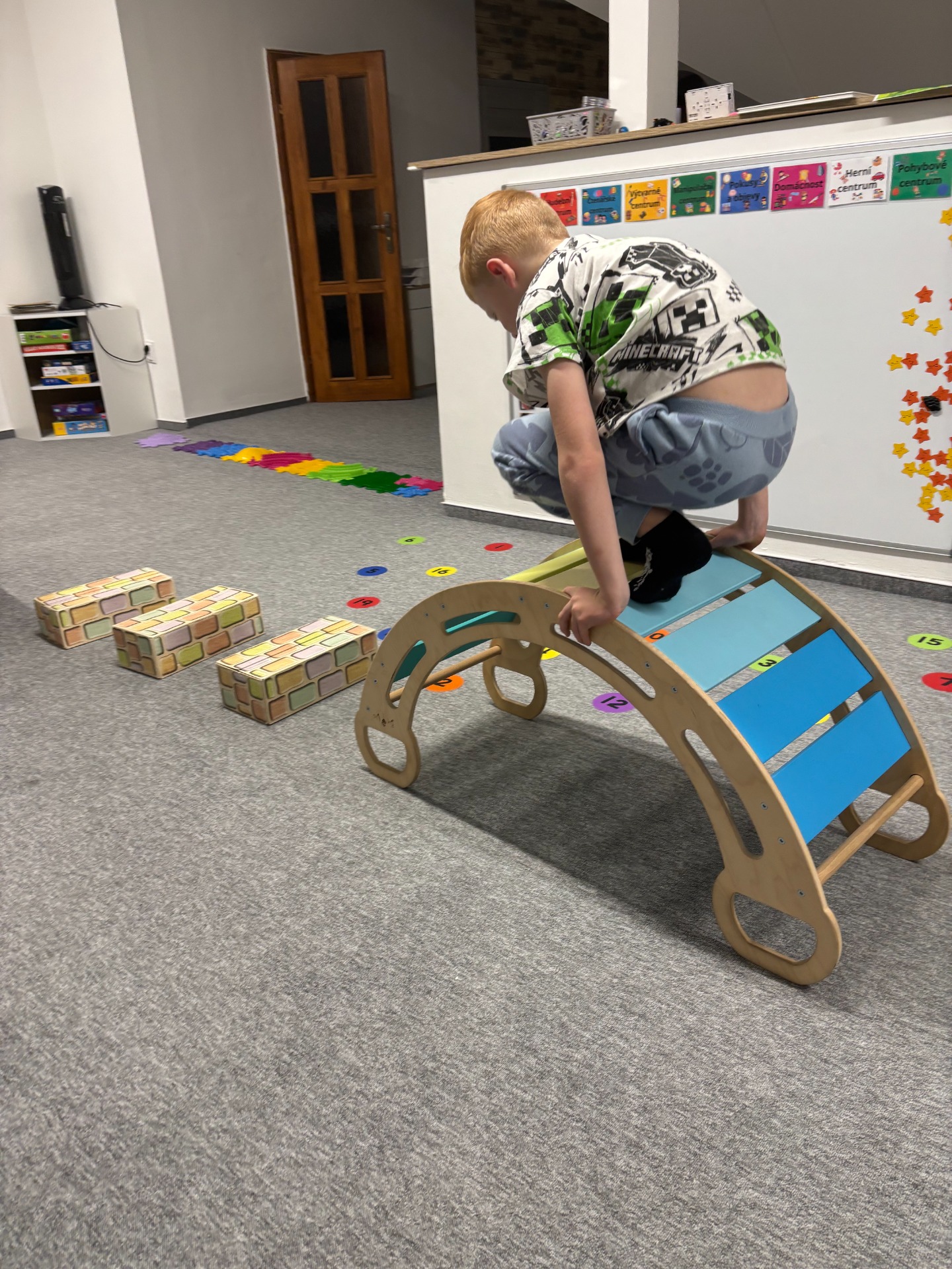 Adriana: My to máme v Petáji postavené hodně přirozeně. Děti nejsou nucené do pohybu, ale mají příležitost se hýbat pořád – při hře, při přechodech, při tvoření. Máme centra aktivit, kde se střídá klid a akce: děti třeba malují na zemi, staví, přenášejí věci, chodí po "opičí dráze", pracují s vodou...